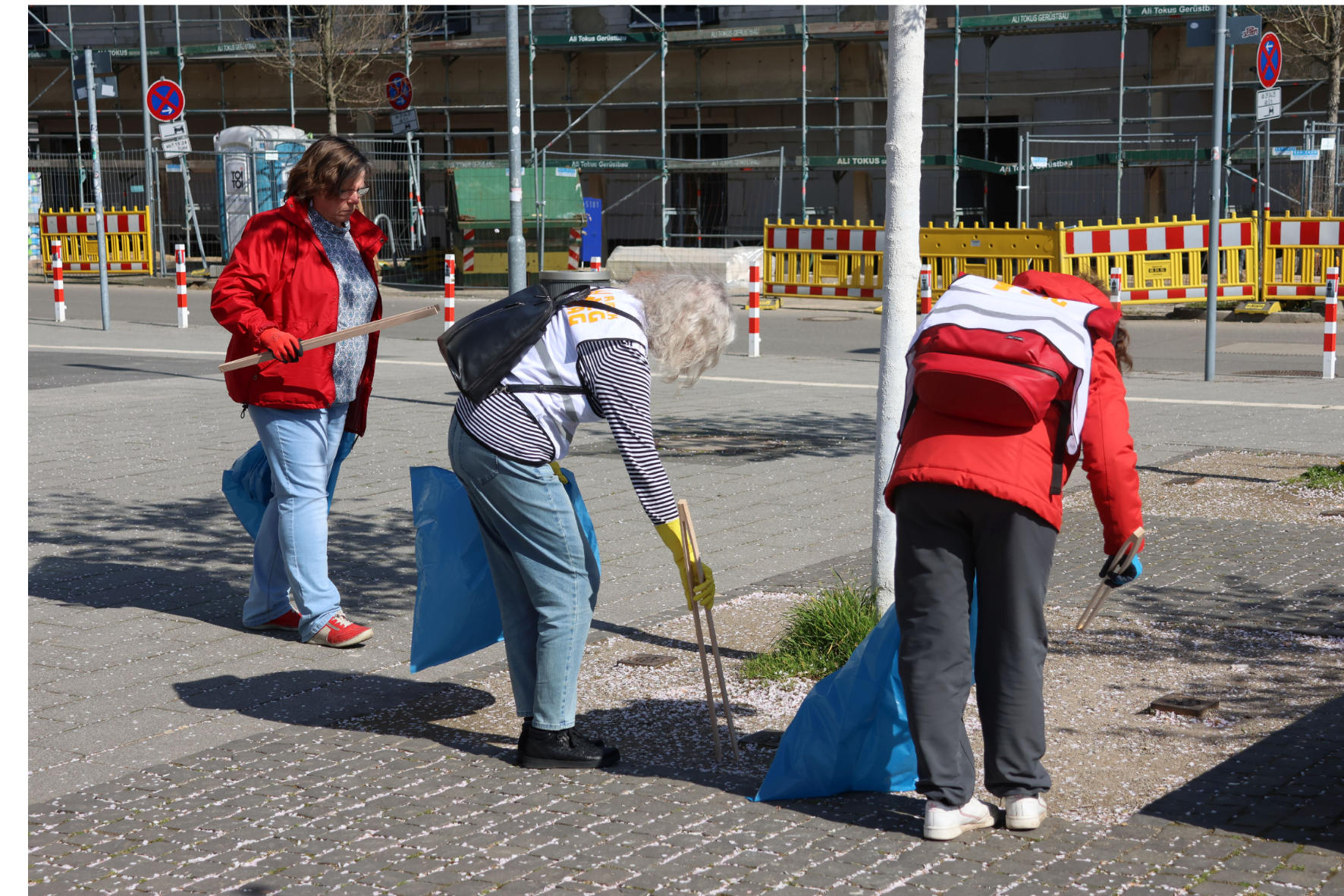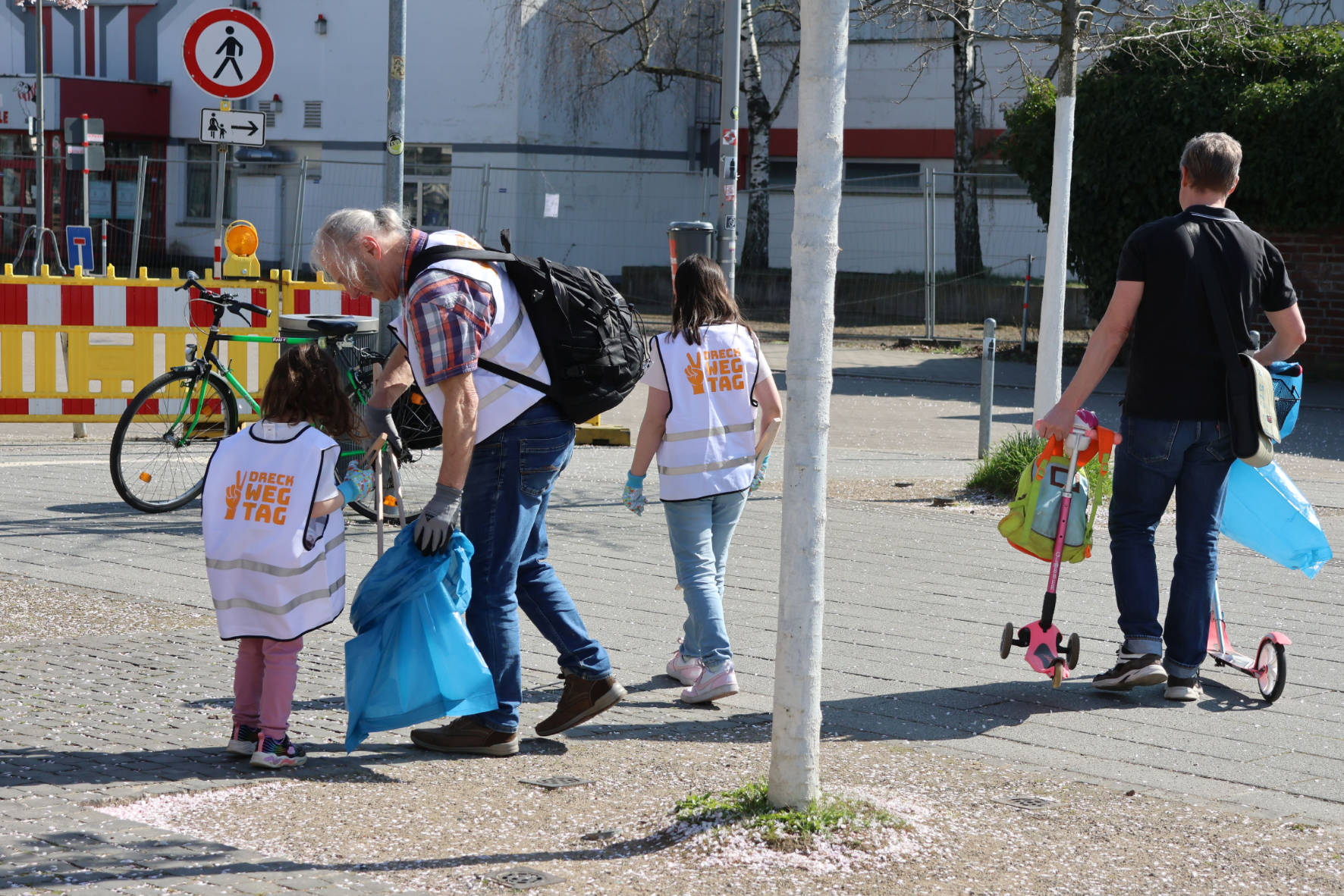 Premiere hatte der Dreck-weg-Tag in der Benrather Paulsmühle. Vor dem Berufskolleg hatten Ilja und Christina eingeladen und das Material für die Gruppe organisiert. Über zwanzig Aktive kamen zusammen, darunter Mitglieder der Benrather Initiative Nachhaltigkeit ebenso wie Menschen, die in die Neubaugebiete im Viertel gezogen waren. Aufgeteilt in kleinen Gruppen machten sie sich ans Werk und auch hier kam einiges an Müll zusammen